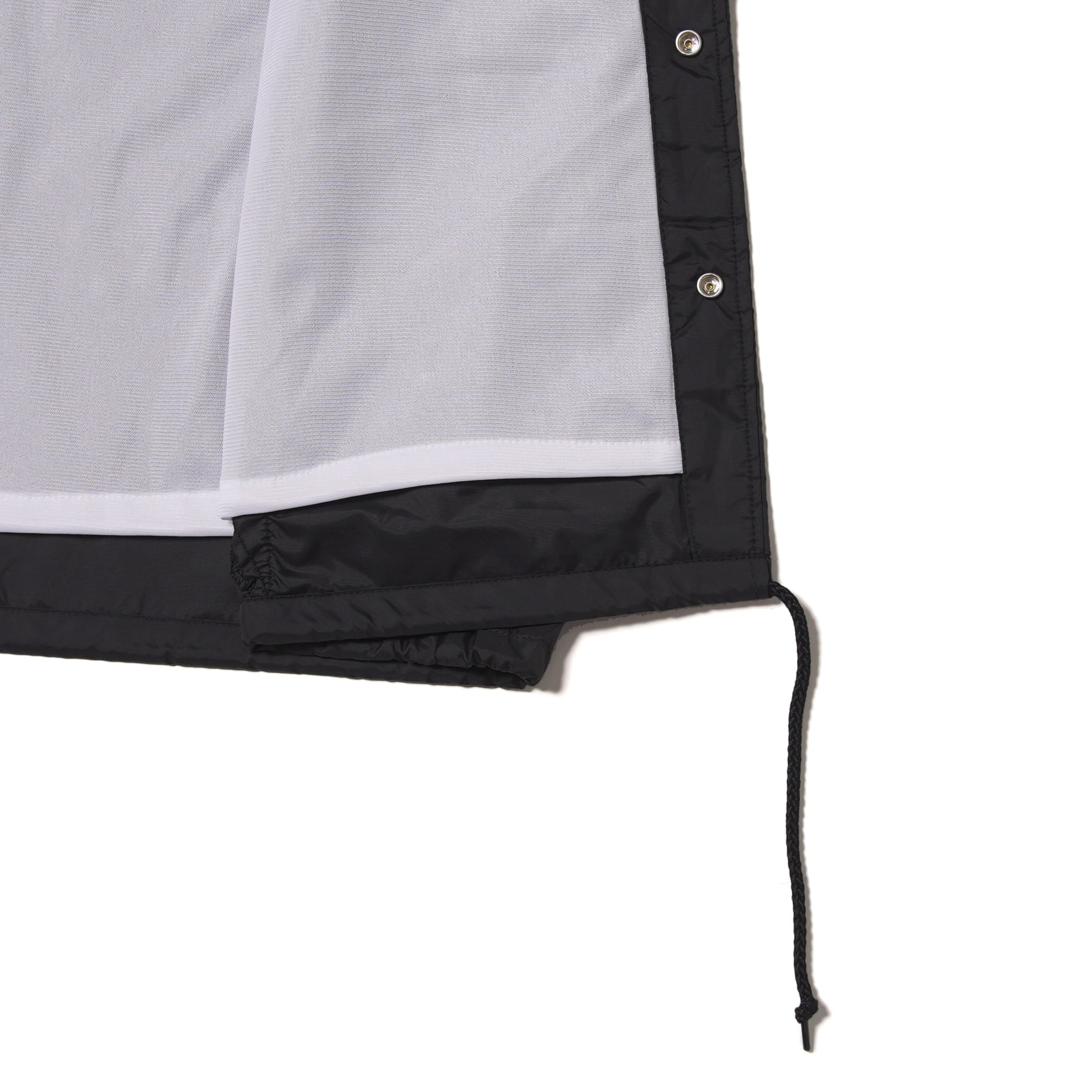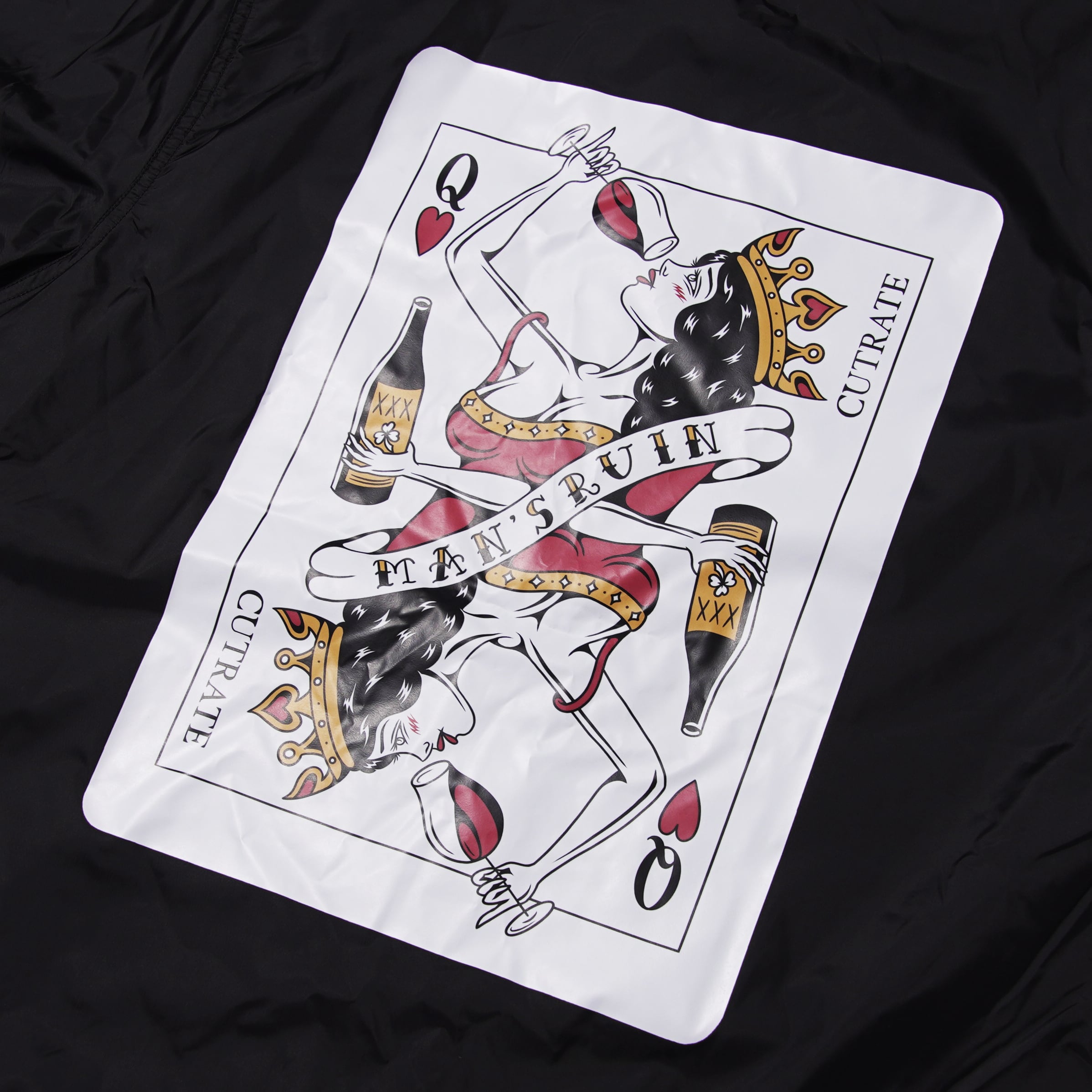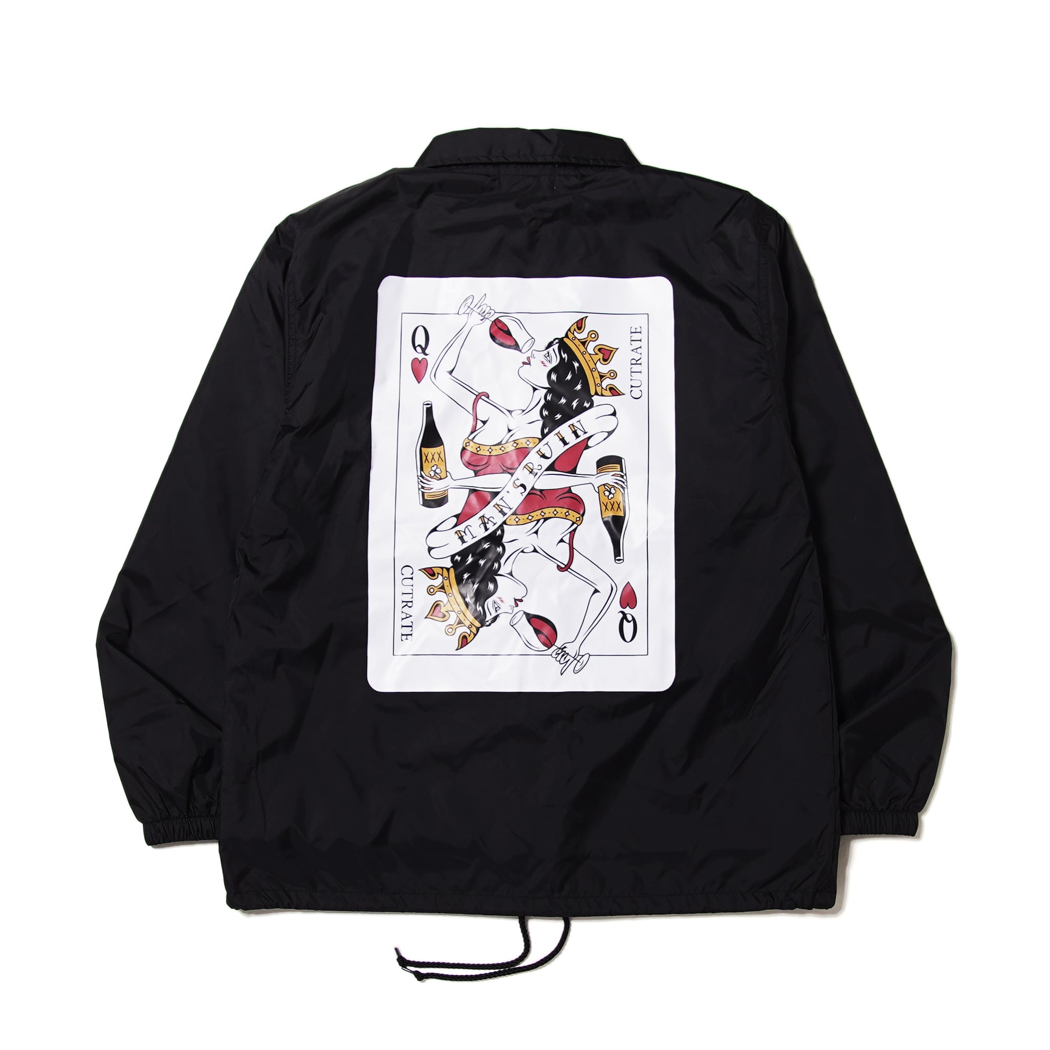 フロント、バックにプリントが入ったナイロンコーチジャケット。フロントにブランドネーム、バックにはQUEENをモチーフにしたトランプのデザインがプリントで入る。