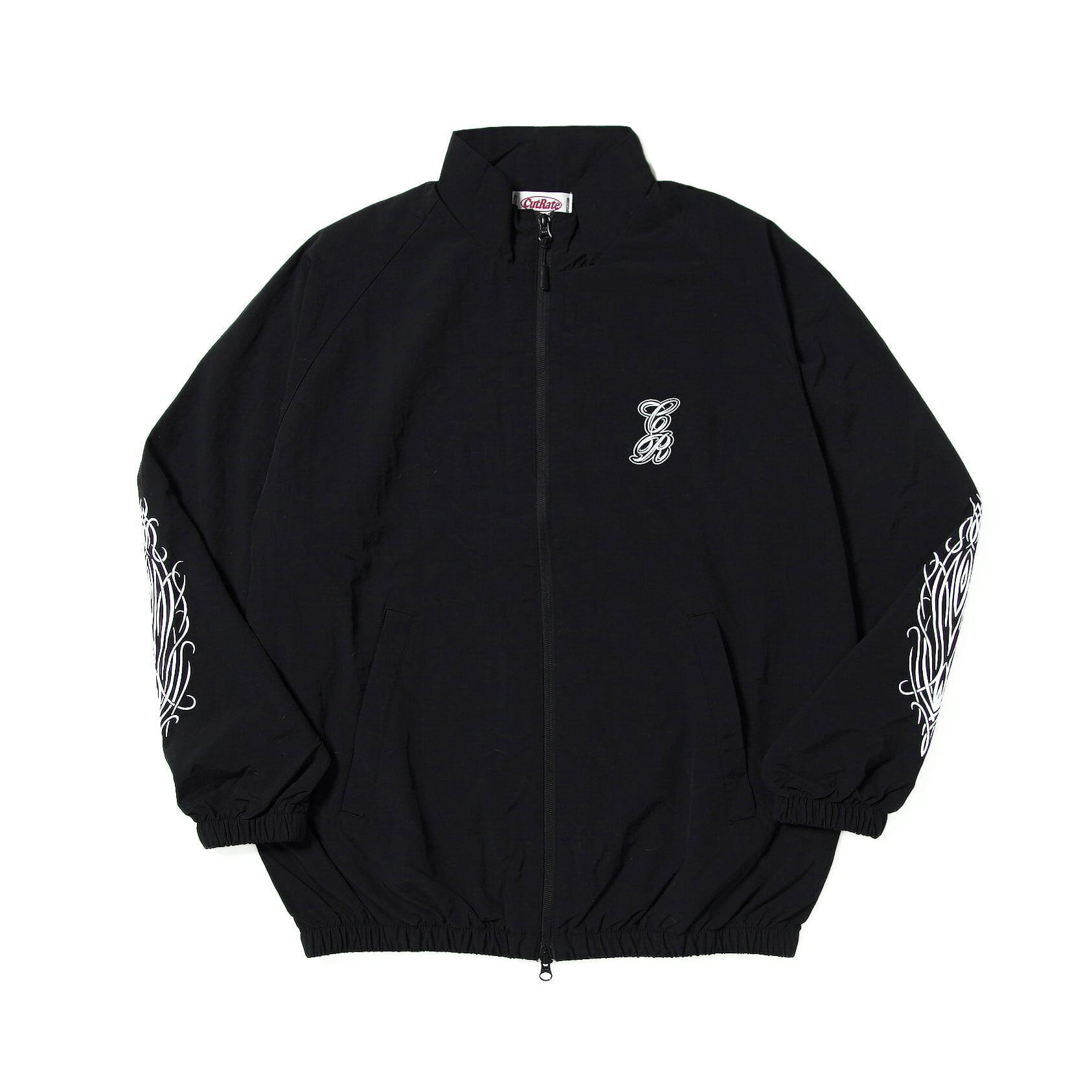 ナイロントラックジャケット。メッシュ素材のライナー付き。袖口と裾口はシャーリング仕様。
