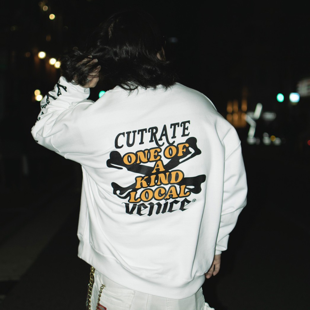 VENICE8 COFFEE HOUSE®️にデザイン製作を依頼したクルーネックスウェット。テーマに掲げるONE OF A KIND LOCALとCUTRATEのロゴがフロント、バックにプリントで入る。袖にはクロスボーンラインがプリントで入る。シルエットはドロップショルダーのスウェットで製作。