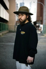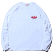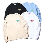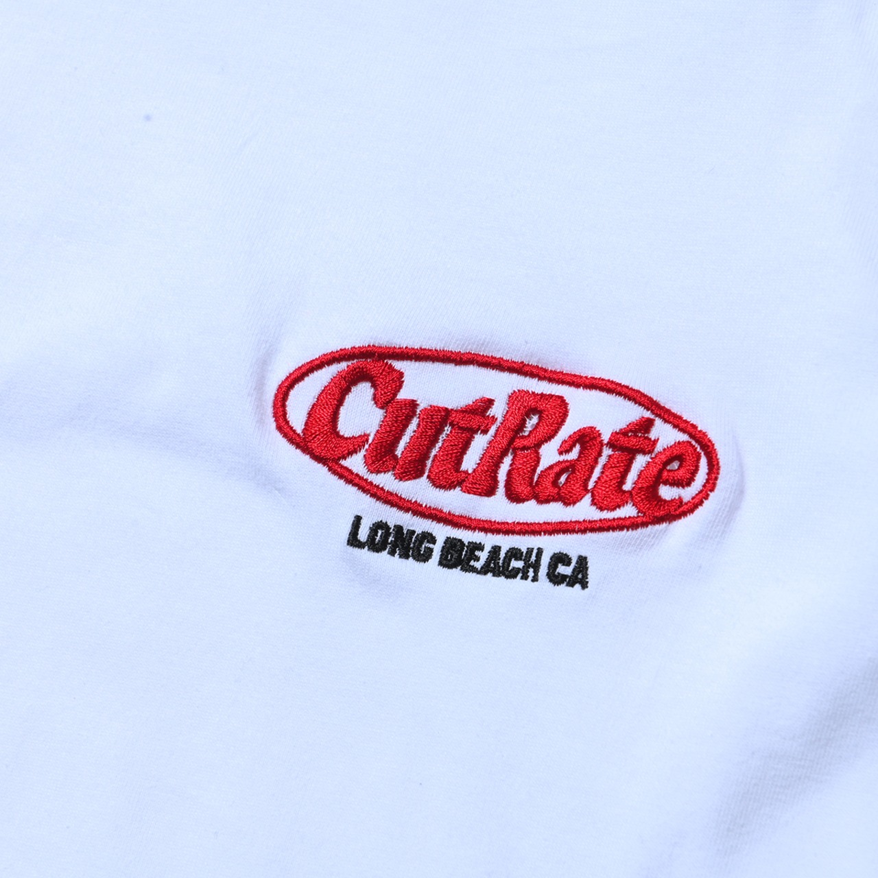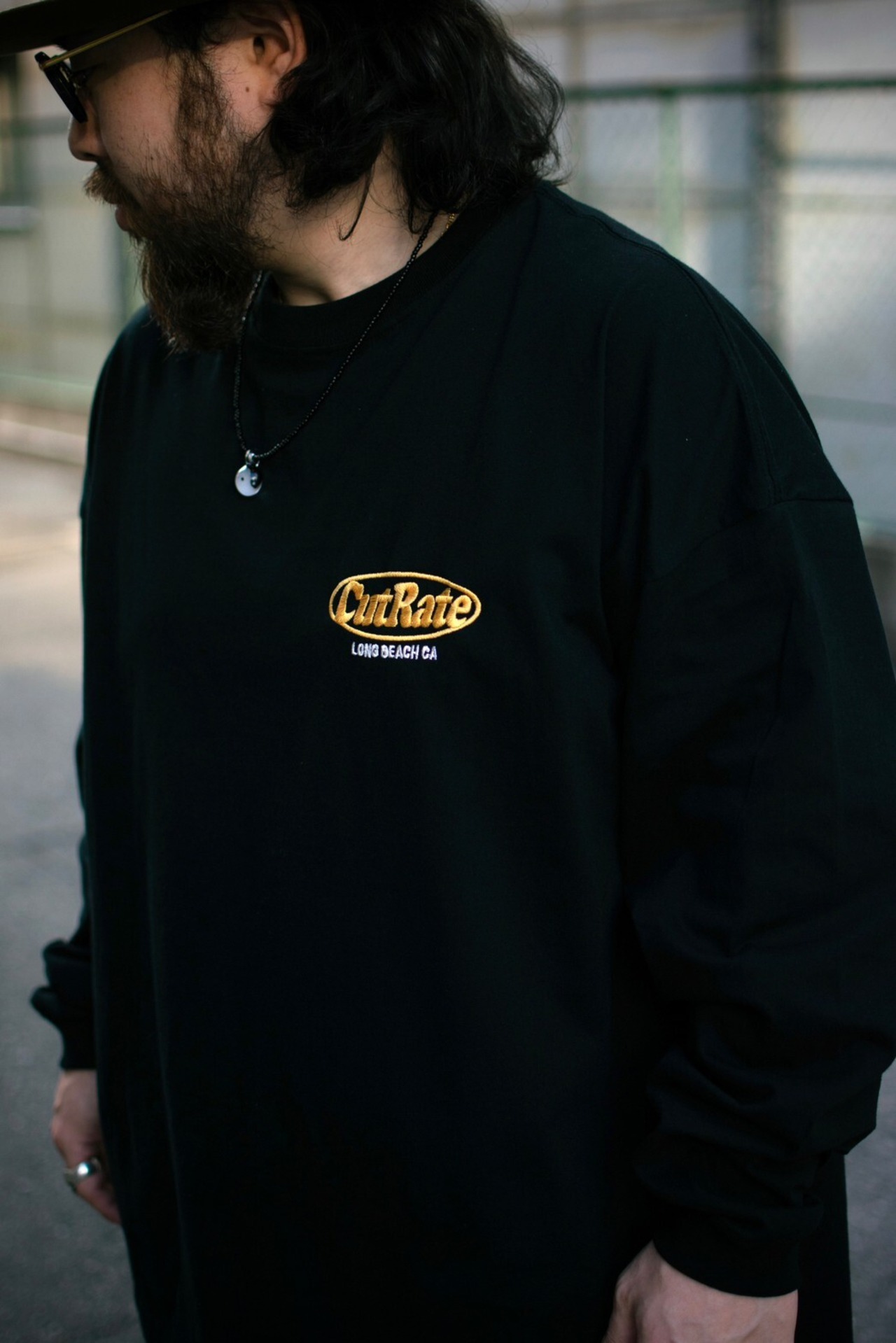 CUTRATEのMAIN LOGOをフロントの胸元にワンポイント刺繍で落とし込んだデザイン。バッシルエットはドロップショルダーのL/S TEEで製作。