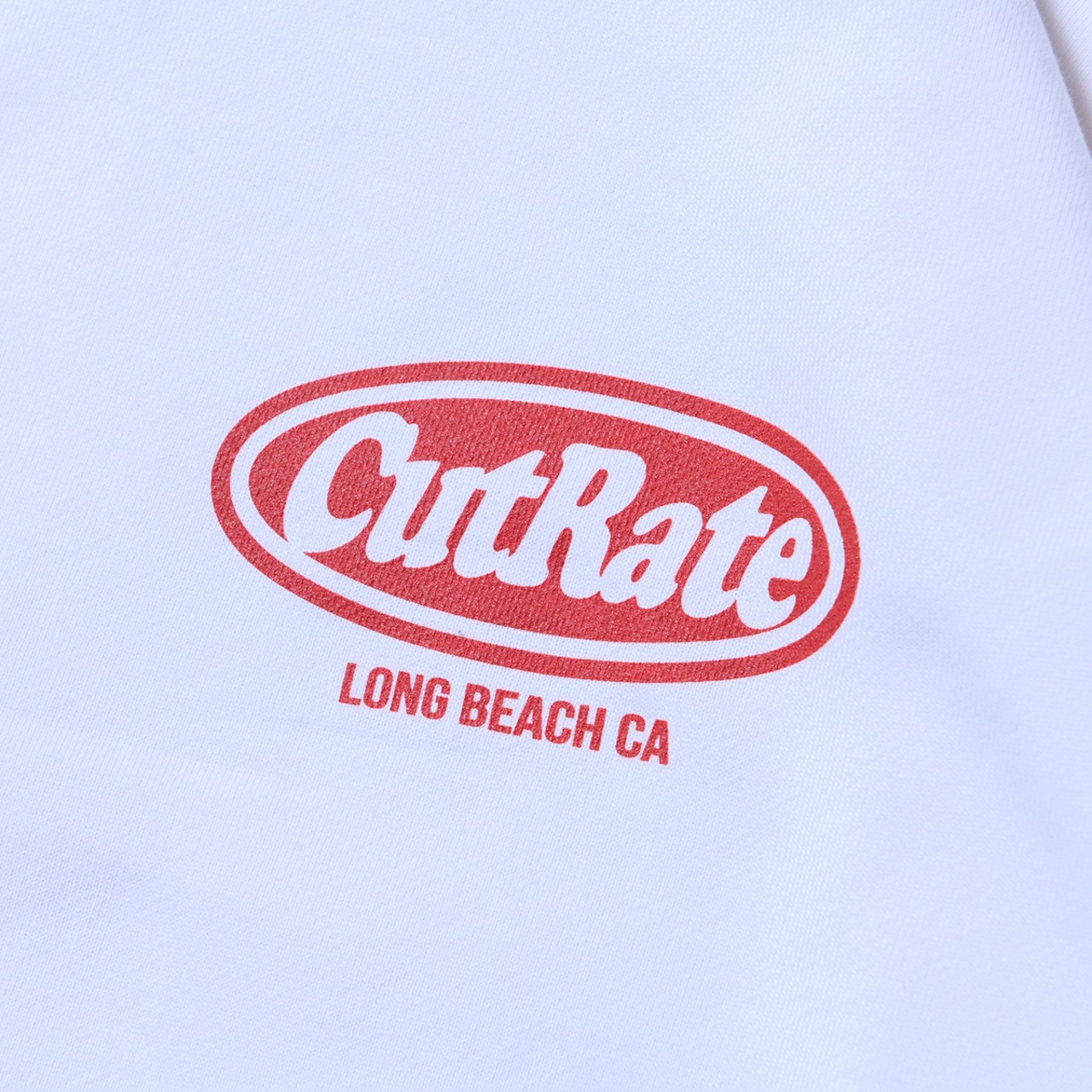 CUTRATEのMAIN LOGOをフロントにプリントで落とし込んだデザイン。バックにもCUTRATEのMAIN LOGOのプリントが入る。シルエットはレギュラーシルエットのクルーネックスウェットで製作。