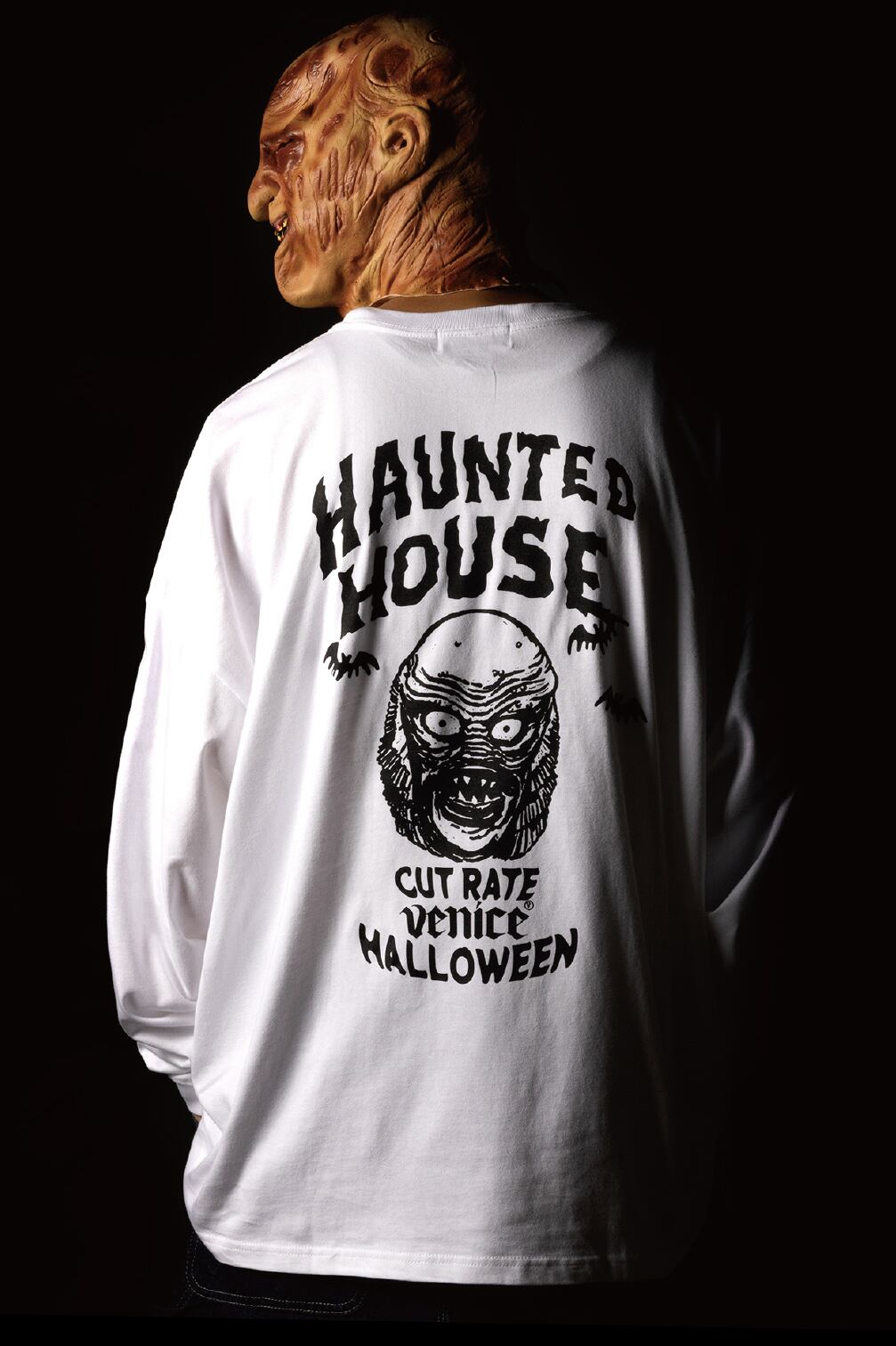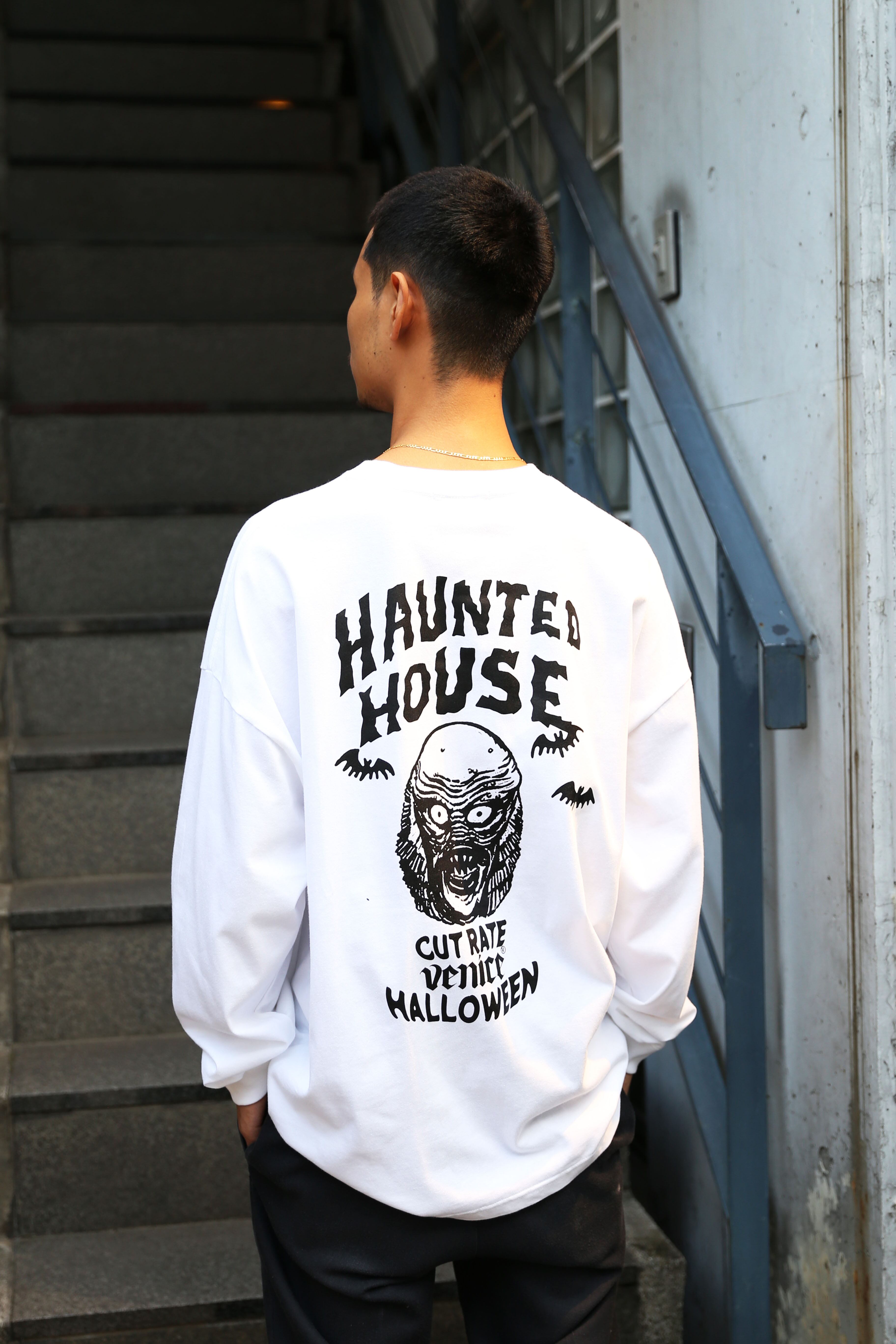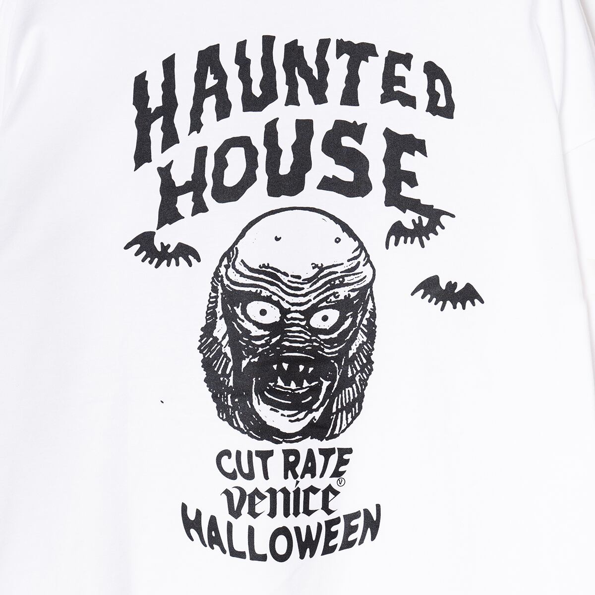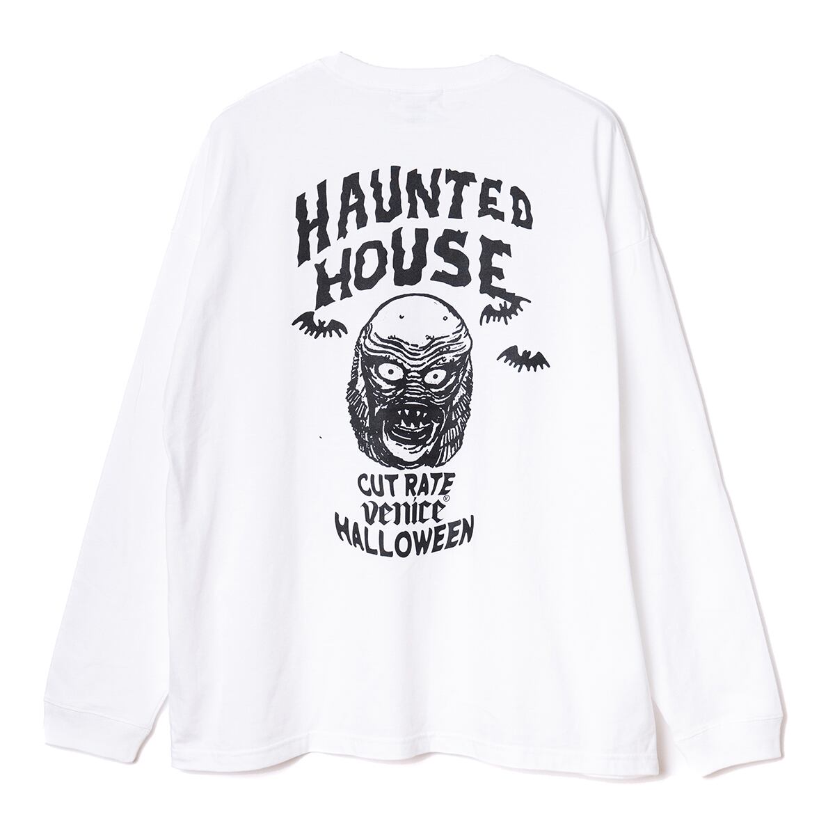 HORROR NIGHTに遊び心を取り入れたグラフィックで製作したL/S TEE。アメリカナイズなクラシックでポップなグラフィックに仕上げ一枚。フロントには"ジャックオーランタン”をイメージさせるワンポイントプリントにバックは”MERMAN”と”WOLF”のプリントが入る。ドロップショルダータイプ。