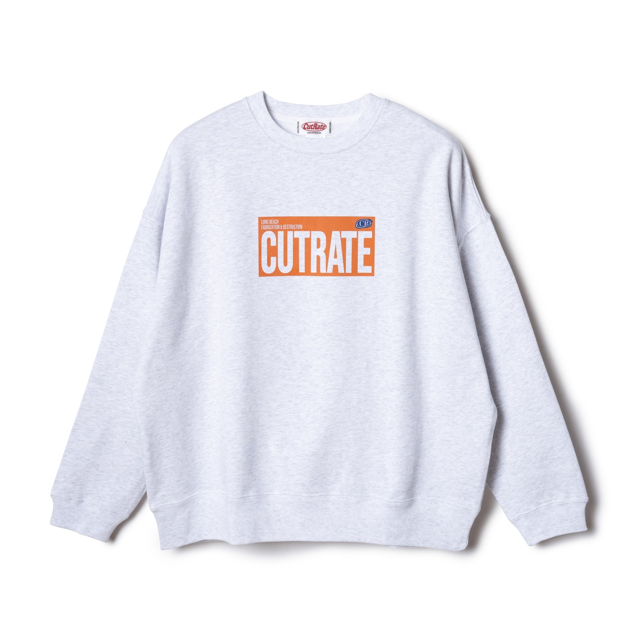 CUTRATEのBOX LOGOをフロントに落とし込んだクルーネックのスウェット。シルエットはドロップショルダーのクルーネックのスウェットで製作。