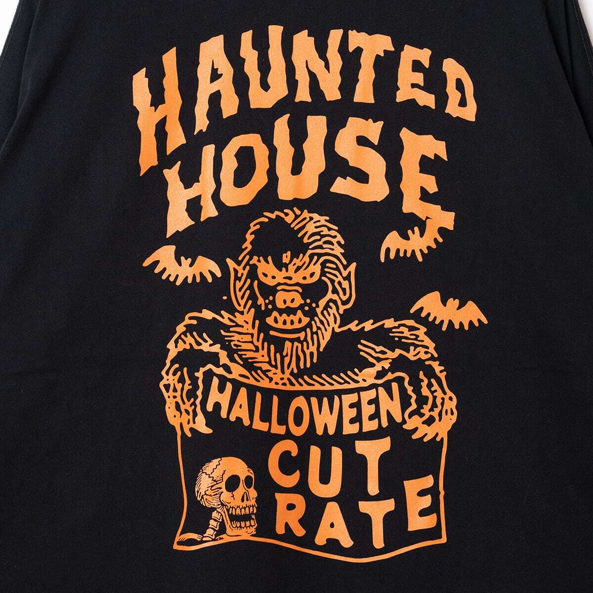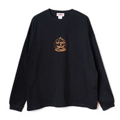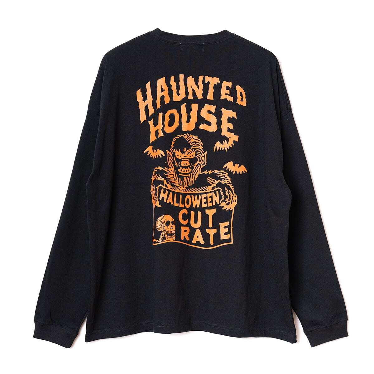 HORROR NIGHTに遊び心を取り入れたグラフィックで製作したL/S TEE。アメリカナイズなクラシックでポップなグラフィックに仕上げ一枚。フロントには"ジャックオーランタン”をイメージさせるワンポイントプリントにバックは”MERMAN”と”WOLF”のプリントが入る。ドロップショルダータイプ。